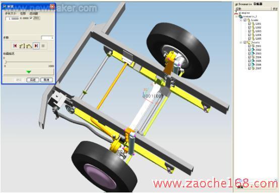 分析時(shí)單擊 單步向前、單步向后 按鈕,對(duì)輪轉(zhuǎn)向進(jìn)行動(dòng)態(tài)的觀察。通過(guò)觀察可以檢查出車輪作轉(zhuǎn)向運(yùn)動(dòng)時(shí)相關(guān)部件間有無(wú)運(yùn)動(dòng)干涉情況、運(yùn)動(dòng)中各部件的間隙是否足夠。根據(jù)檢查結(jié)果來(lái)調(diào)整布置方案或重做部件設(shè)計(jì)。根據(jù)以上分析確定了前減震器的安裝位置。