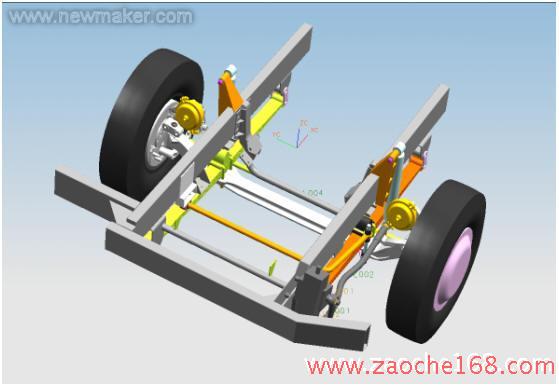 2.建立裝配主模型。把建好的各個(gè)部件按底盤布置參數(shù)要求裝配好。