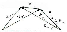 一般情況下,液流在葉輪進(jìn)口處并不與葉片骨線進(jìn)口方向一致。這樣就會引起旋渦損失以及脫流區(qū) 使流道收縮而引起的附加摩擦損失。進(jìn)口的相對速度ω 0與骨線間的夾角Δβc為沖角,見圖2。 Δβc有正負(fù)之別。ω0流向葉片工作面時, Δβc正;ω0流向葉片背面時, Δβc負(fù)。葉片工作面壓力高、背面的壓力低。
