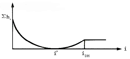 可見,液力變矩器總的沖擊損失在i≤iDH時, 是以縱坐標(biāo)i=i’為對稱的拋物線,在i>iDH時,近 似為常量,如圖7所示。當(dāng)i=i’時,Σhc=0,說明 在泵輪的轉(zhuǎn)速與渦輪轉(zhuǎn)速接近時,無沖擊損失;當(dāng)i=0時,沖擊損失最大,這與工程機(jī)械的工作情況 相符。