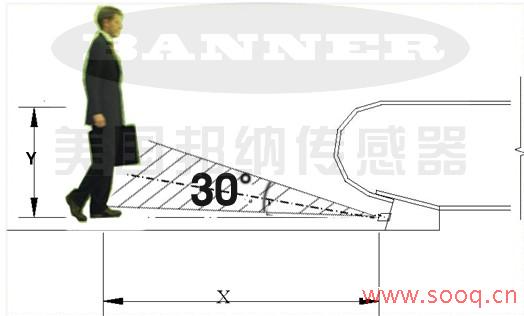 為了確保每一個(gè)從不同方向走過(guò)來(lái)的乘客都能被探測(cè)到,需要將傳感器的安裝位置朝向扶梯的內(nèi)側(cè),這樣就可以使兩道超聲波產(chǎn)生交匯,扶梯入口前方形成一個(gè)無(wú)盲區(qū)的探測(cè)帶。通過(guò)T30UX背部的按鍵調(diào)節(jié),可以設(shè)定感應(yīng)范圍,并且會(huì)產(chǎn)生一個(gè)等腰三角形形狀的探測(cè)光束區(qū)域。一旦有行人朝扶梯入口處走來(lái),如圖1所示,就可以被聲波感應(yīng)到。