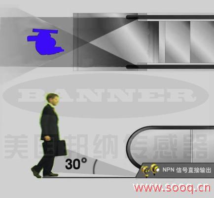 在自動(dòng)扶梯出入口每一側(cè)扶手帶的下面安裝一個(gè)超聲波傳感器T30UX,利用發(fā)射的超聲波照到人體身上,并接受到反射的聲波,就可以在扶梯入口處探測(cè)到乘客之后發(fā)出一個(gè)NPN/PNP或者繼電器信號(hào)。從而為扶梯執(zhí)行機(jī)構(gòu)(電機(jī)驅(qū)動(dòng)系統(tǒng))提供準(zhǔn)確的運(yùn)行指令,達(dá)到有乘客時(shí)運(yùn)行,無(wú)乘客時(shí)切換至節(jié)能狀態(tài):