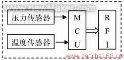 輪胎監(jiān)測(cè)模塊嵌入到輪胎內(nèi)部,主要用來(lái)監(jiān)測(cè)輪胎內(nèi)部的氣壓和溫度狀況,并通過(guò)無(wú)線調(diào)制方式發(fā)送到主機(jī)顯示模塊,故輪胎監(jiān)測(cè)模塊主要包含傳感器、微控制器、UHF發(fā)射器以及供電電池。