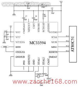 接收接口電路如圖3所示,MC33594是高溫集成UHF超高頻無(wú)線電接收模塊。該芯片的工作頻率為300~450MHz,電壓在4.5~5.5V范圍內(nèi);接收靈敏度高達(dá)-103dBm。其最大的特點(diǎn)是帶有一串行外設(shè)接口(SPI)。通過(guò)SPI,它允許微控制器與各種外圍接口器件以串行方式進(jìn)行通信。SPI接口使用四條線:串行時(shí)鐘線(SCK),主機(jī)輸入/從機(jī)輸出數(shù)據(jù)線MISO,主機(jī)輸出/從機(jī)輸入數(shù)據(jù)線MOSI和低電平有效的從機(jī)選擇線RESET。