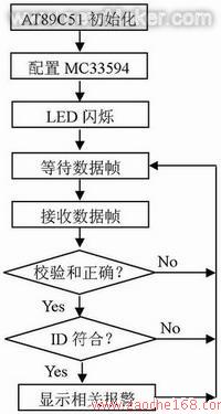 圖4給出了接收模塊的接收程序流程圖,接通電源后,接收機(jī)先后進(jìn)行初始化和配置。一旦確認(rèn)接收機(jī)配置完成,所有的LED就閃爍一次告知使用者模塊準(zhǔn)備就緒。在收到一個(gè)數(shù)據(jù)幀后,就要重新計(jì)算校驗(yàn)并與己經(jīng)接收到的數(shù)據(jù)幀進(jìn)行比較。數(shù)據(jù)幀經(jīng)過(guò)確認(rèn)后,某個(gè)輪胎和ID則要與存儲(chǔ)在KX8存儲(chǔ)器中的4個(gè)ID值比較。如果發(fā)現(xiàn)一個(gè)相配的ID,則數(shù)據(jù)就被處理并點(diǎn)亮相應(yīng)的LED。最后,數(shù)據(jù)幀通過(guò)串行口發(fā)送出去以供外部數(shù)據(jù)接收和存儲(chǔ)。