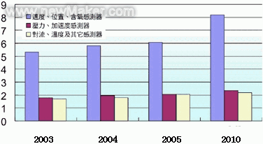 其次便是車用動力傳感器,包括,速度與氧氣傳感器增長率為6.7%、壓力與加速度傳感器為5.7%、空氣流量、溫度與其它傳感器增長率約為4.6%,年增長率約為6.2%;在所有傳感器組件中,則以速度與氧氣傳感器產(chǎn)值最高,預(yù)估將從2005年的62億美元提升至2010年的86億美元。