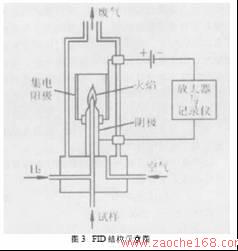 氫火焰離子化分析儀(FID,Flame Ionization Detector)是用來(lái)測(cè)定內(nèi)燃機(jī)排氣中未燃碳?xì)浠衔餄舛鹊膬x器之一。由于氫氣與空氣燃燒離子化作用非常小,但如果將有機(jī)碳?xì)浠衔飳?dǎo)入氫火焰中,在氫火焰的高溫(2000℃)作用下,部分分子和原子就會(huì)離子化生成大量的自由離子,離子化的程度與碳?xì)浠衔锓肿又刑荚訑?shù)成正比關(guān)系。FID就是通過(guò)以上現(xiàn)象,外加適當(dāng)電場(chǎng),使自由離子形成離子電流并產(chǎn)生微電流信號(hào),那么通過(guò)測(cè)量離子電流的大小即可確定試樣氣中碳?xì)浠衔镆蕴荚佑?jì)量的濃度。圖3所示的就是FID結(jié)構(gòu)示意圖。