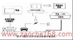 OEM-2100單元由5個(gè)主要的子系統(tǒng)構(gòu)成:電腦、輕型車掃描器、重型車掃描器、微粒物監(jiān)控器及雙重氣體分析儀。此外,還有幾個(gè)可選擇的設(shè)備,包括全球定位系統(tǒng)(GPS)、預(yù)先催化取樣器、加熱取樣管、重型發(fā)動(dòng)機(jī)掃描儀和通用傳感器列,這些設(shè)備根據(jù)測(cè)試需要,進(jìn)行選擇性的安裝。圖4所示的是OEM-2100系統(tǒng)安裝和數(shù)據(jù)傳輸?shù)氖疽鈭D。