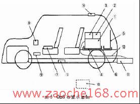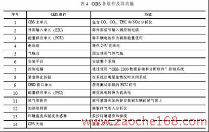 OBS和其他PEMS系統(tǒng)一樣,可以很方便地安放在被測(cè)車輛上。圖5所示的是OBS系統(tǒng)在被測(cè)車輛上的布置示意圖。表4列出的是OBS各組件及其功能(表4中的序號(hào)對(duì)應(yīng)圖5)。