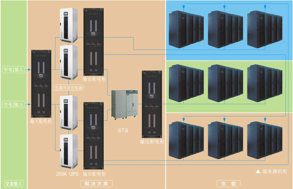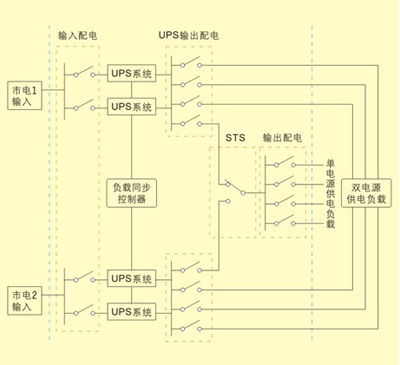 兩組UPS通過(guò)負(fù)載同步控制器達(dá)到同頻率、同相位的輸出 。這樣利用STS時(shí)候就能達(dá)到零轉(zhuǎn)換。使后端單電源供電的負(fù)載能得到最大的保護(hù)。