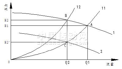 2.現(xiàn)有控制流量方式 常規(guī)情況下油田高壓注水采用閘板閥門控制來調(diào)節(jié)流量和壓力。根據(jù)工藝要求,不允許長時間小排量運行,否則泵內(nèi)溫度升高造成汽蝕和機件燒毀等問題,過去被迫采用大回流方法降低溫升,造成電力的大量消耗,給油田造成了大量的能源損失。 在原設(shè)計系統(tǒng)工況中,用兩臺D(F)250-150注水泵進行系統(tǒng)注水。在未進行變頻調(diào)速改造中,該工況的注水系統(tǒng)能耗損失主要在控制閥節(jié)流上。通過分析,只有通過結(jié)合配注量,降低水壓,減少各注水井的閥門控制壓差,才能達到節(jié)能降耗的目的。 4.注水泵變頻調(diào)速的節(jié)能原理 注水泵是典型的變轉(zhuǎn)矩負載。變轉(zhuǎn)矩負載的特性是轉(zhuǎn)矩隨速度的上升而上升。注水泵的電動機的軸功率P與其流量Q,揚程H之間的關(guān)系式如下: P∝Q×H (1) 當流量Q1由變化到Q2時,電動機的轉(zhuǎn)速為N1、N2,此時Q、H、P相對于轉(zhuǎn)速的關(guān)系如下: Q2=Q1×(N2/N1) H2=H1×(N2/N1)2 P2=P1×(N2/N1)3 由式(1)和式(2)可以看出,水泵的電動機的軸功率(功率輸出)與轉(zhuǎn)速的3次方成正比,而轉(zhuǎn)矩與轉(zhuǎn)速的2次方成正比。所以當需要80%的額定流量時,通過調(diào)節(jié)電機的轉(zhuǎn)速至額定轉(zhuǎn)速的80%,即調(diào)節(jié)頻率到40Hz即可,這時所需功率將僅為原來的51.2%,系統(tǒng)工作點變化如下圖所示: