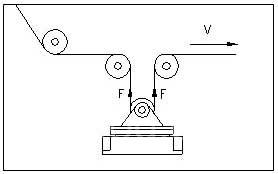 力傳感器式張力檢測單元是通過檢測輪將卷料張力以微變形的方式反映到壓力傳感器上,然后通過應(yīng)變檢出裝置檢出張力,再將信號經(jīng)放大后送張力控制運算單元處理(如下圖)。由于傳感器自重及檢測輪及卷料的重量的存在,