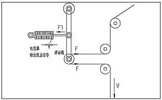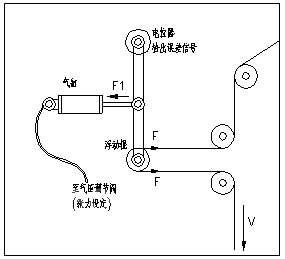 氣壓浮輥式張力檢測單元通過對連接在檢測輥浮動擺臂上的氣缸氣壓的調(diào)節(jié)來檢測卷料的張力,當(dāng)氣缸氣壓設(shè)定后,擺臂上的氣缸推力F1即為定值,如浮動輥上的卷料拉力2F(F為卷料張力)加擺輥重力的水平分量不能與F1平衡,則擺臂即偏離原來的位置,而使連接于擺臂端的電位器發(fā)生偏轉(zhuǎn),忽略擺輥重力的影響,此偏轉(zhuǎn)即為實際張力與設(shè)定值的偏差。通過張力伺服系統(tǒng)控制糾偏后,浮動輥應(yīng)停流在圖示的平衡位置,此時,擺輥重力的影響亦自然消除,實際卷料張力與期望值相等。處于平衡態(tài)的該類系統(tǒng),當(dāng)發(fā)生較強擾動時,如系統(tǒng)瞬間來不及發(fā)生反應(yīng),則卷料上的張力波動可暫時因浮動輥的偏擺而得到有效緩解。在某些機構(gòu)中,圖中的氣缸可由彈簧及阻尼機構(gòu)替代,從而演化為下圖所示的模式。