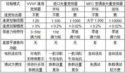 下表是幾種主要控制模式變頻器的性能、特色比較: