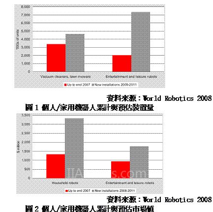 至2007年底為止全球家務(wù)用機(jī)器人計(jì)有340萬臺,娛樂休閒用機(jī)器人200萬臺;2008~2011年全球預(yù)估將有家務(wù)用機(jī)器人460萬臺,娛樂休閒用735萬臺,合計(jì)約1仟2佰多萬臺安裝量,未來四年市場總值合計(jì)約57億美元。(參見圖1、圖2)