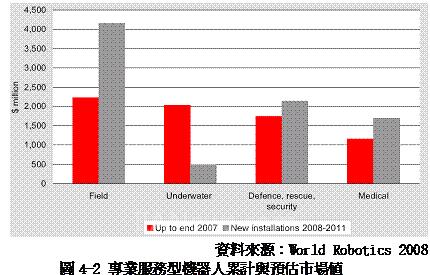 預(yù)估2008年至2011年專業(yè)服務(wù)型機(jī)器人的裝置量預(yù)估將達(dá)到54,000臺。其中農(nóng)林礦牧用機(jī)器人(Field Robots)最多,共將有19,110臺;防御救災(zāi)與保全機(jī)器人(Defence, rescue, security robots)預(yù)計(jì)將有15,600臺銷售量;專業(yè)清潔機(jī)器人亦約有4,000臺銷售量;醫(yī)療用機(jī)器人約達(dá)3,420臺;多用途機(jī)器人移動(dòng)平臺(Mobile Robot Platforms)約2,375臺;水底作業(yè)系統(tǒng)預(yù)估將有超過925臺銷售量。