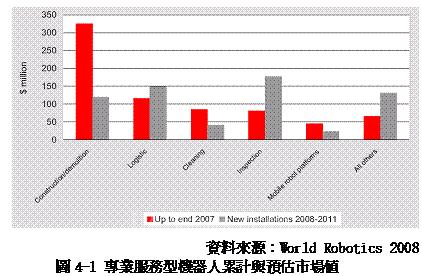 至2007年底為止有49,000臺的使用數(shù)量,較2006年底的39,900臺增加約9,100臺。預(yù)計(jì)2008~2011年將增加54,000臺專業(yè)服務(wù)型機(jī)器人,總價(jià)值約91.2億美元。(參見圖3、圖4)根據(jù)IFR統(tǒng)計(jì)資料顯示:至2007年底為止,全球?qū)I(yè)服務(wù)型機(jī)器人累計(jì)裝置數(shù)量為49,000臺。其中包括水底作業(yè)系統(tǒng)、專業(yè)清潔、建筑與拆除機(jī)器人、醫(yī)療機(jī)器人、機(jī)器人移動(dòng)平臺、農(nóng)林礦牧、防御救災(zāi)與保全、物流、檢驗(yàn)與公共關(guān)係等用途,總市場值約近78億美元。專業(yè)服務(wù)型機(jī)器人的應(yīng)用范疇殊異且單價(jià)差距頗大,有低于1萬美元者,亦有高于30萬美元者,視其應(yīng)用領(lǐng)域的功能要求而定。水底作業(yè)系統(tǒng)的單價(jià)最高,從30萬美元至超過100萬美元均有,屬于最昂貴之類型;其次為醫(yī)療用機(jī)器人,約自10萬美元至數(shù)百萬美元。