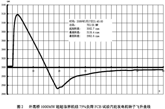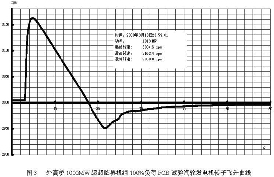 08 年 3 月巧日和 16 日,外高橋三期工程第一臺機組先后進行了 75 %和 100 %的甩負荷試驗。試驗采用全真運行工況,試驗前不作任何預(yù)防性措施和操作,唯一做的就是拉開發(fā)電機出口開關(guān)。這兩次試驗都獲得了成功。通過試驗,也發(fā)現(xiàn)了控制系統(tǒng)內(nèi)尚存的個別不足,經(jīng)修改邏輯后于 3 月 17 日晚 21 : 40 進行了全真運行工況的 75 %負荷的 FCB 試驗。這次試驗非常成功,所有運行參數(shù)都很平穩(wěn),汽輪發(fā)電機轉(zhuǎn)子在主變壓器出口開關(guān)拉閘的 2s 后轉(zhuǎn)速達到 3118.4 rpm,17s 后降至 2952.6 rpm,約40s 后轉(zhuǎn)速趨于穩(wěn)定,見圖2。由于再熱安全門沒有開啟,工質(zhì)平衡不存在問題。在這次試驗中,按計劃還要做50OKV線路開關(guān)和聯(lián)絡(luò)開關(guān)的假并列試驗,故孤島狀態(tài)運行了近一個小時,于22:39:07再次并網(wǎng)。這次試驗還說明,機組完全可以在孤島狀態(tài)下安全運行較長時間。