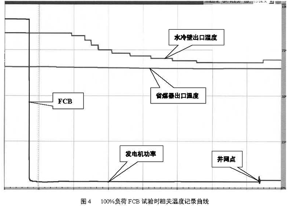 按三期的設(shè)計,在汽輪發(fā)電機甩負荷時,鍋爐通過旁路系統(tǒng)維持運行。從熱力系統(tǒng)角度,其工況的變化與FCB 時最為相似,甚至更極端。兩者不同之處在于廠用電的供電方式,在甩負荷時,廠用電由電網(wǎng)倒送,相對較為安全。因此在進行FCB 試驗前,應(yīng)先完成全真運行工況的甩負荷試驗,在按常規(guī)測取汽輪發(fā)電機轉(zhuǎn)子飛升轉(zhuǎn)速的同時,考核整個熱力系統(tǒng)及相關(guān)控制系統(tǒng)在此工況下的應(yīng)變能力。