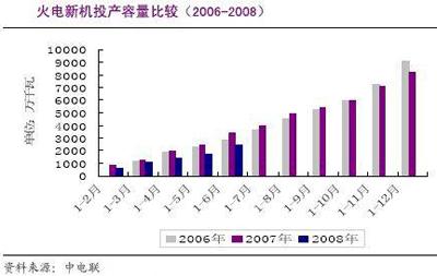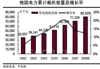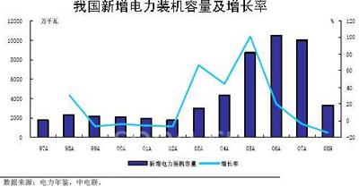 2002年電力體制改革之后,我國(guó)電力工業(yè)獲得了空前發(fā)展。在2004年實(shí)現(xiàn)4億千瓦發(fā)電裝機(jī)的基礎(chǔ)上,自2005年起,我國(guó)發(fā)電裝機(jī)容量每年跨越1億千瓦平臺(tái),先后實(shí)現(xiàn)了5億、6億、7億千瓦的歷史性跨越。自2002年至2007年五年間,我國(guó)新增發(fā)電裝機(jī)規(guī)模約3.5億千瓦,相當(dāng)于建國(guó)至2002年50多年的總和,也相當(dāng)于英國(guó)、法國(guó)、意大利三個(gè)發(fā)達(dá)國(guó)家電力裝機(jī)的總和,創(chuàng)造了世界電力發(fā)展史上的奇跡。2008年中期,我國(guó)電力裝機(jī)容量達(dá)到74000萬千瓦(上半年關(guān)停小火電836萬千瓦)(如圖1),但新增電力裝機(jī)容量增速明顯回落。2008年上半年,新增電力裝機(jī)容量3302萬千瓦,比去年同期少增長(zhǎng)536萬千瓦(如圖2)。2007年,我國(guó)完成電源投資3041億元,同比下降4.81%,是繼2006年之后,連續(xù)兩年下降。2008年上半年,我國(guó)僅完成電源投資1337億元。