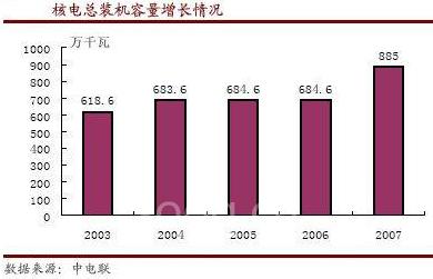 截至2007年底,我國(guó)大陸地區(qū)核電運(yùn)行機(jī)組達(dá)到11臺(tái),運(yùn)行總裝機(jī)容量達(dá)到907.8萬千瓦,比2006年增長(zhǎng)了200萬千瓦,2003-2006年基本沒有增長(zhǎng)(見圖8)。國(guó)家原子能機(jī)構(gòu)的統(tǒng)計(jì)顯示,2007年,我國(guó)核電總發(fā)電量628.62億千瓦時(shí),上網(wǎng)電量為592.63億千瓦時(shí),同比分別增長(zhǎng)14.61%和14.39%。其中,中國(guó)廣東核電集團(tuán)全資和控股的核電機(jī)組4臺(tái),裝機(jī)容量394.8萬千瓦,占全國(guó)核電總裝機(jī)容量的43.5%。我國(guó)目前有秦山一期、秦山二期、秦山三期、大亞灣、嶺澳和田灣等6座核電站的11臺(tái)核電機(jī)組投入運(yùn)行。