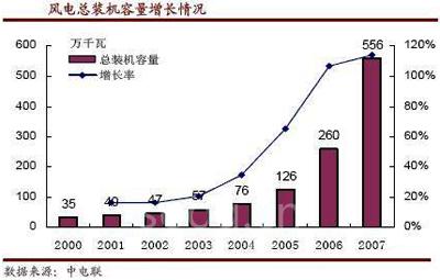 但截至2006年底,我國(guó)風(fēng)力發(fā)電的裝機(jī)容量?jī)H占電力總裝機(jī)容量的0.42%,出于改善過于依賴煤炭資源的狀況和考慮到環(huán)保壓力,中國(guó)風(fēng)電裝機(jī)容量占電力總裝機(jī)容量的提升空間很大。根據(jù)我國(guó)的可再生能源發(fā)展規(guī)劃,2010年、2020年風(fēng)電的發(fā)展目標(biāo)分別為1000萬千萬和3000萬千瓦。結(jié)合我國(guó)風(fēng)力資源狀況,風(fēng)電作為最具大規(guī)模商業(yè)開發(fā)前景的可再生能源必將得到超常發(fā)展??梢灶A(yù)測(cè),到2010年我國(guó)實(shí)際的風(fēng)電總裝機(jī)容量將達(dá)到2000萬千瓦,2020年將達(dá)到8000萬千瓦。