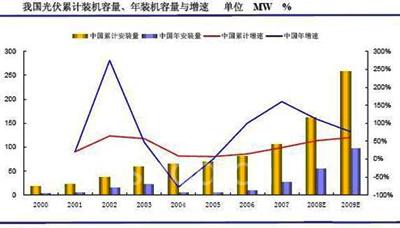 2007年,我國(guó)光伏發(fā)電設(shè)備新增裝機(jī)容量26MW,僅比上年增長(zhǎng)16MW,較低的基數(shù)反映在數(shù)字上卻是驚人的160%的增長(zhǎng),年累計(jì)光伏裝機(jī)容量為106MW,同比增長(zhǎng)32.5%,與全球裝機(jī)容量的平均增速持平,但只占全球總裝機(jī)容量的1.16%。對(duì)比全球光伏市場(chǎng)的銷售結(jié)構(gòu),2007年僅無錫尚德年產(chǎn)光伏組件就達(dá)200MW,占全球光伏電池市場(chǎng)份額達(dá)5%。我國(guó)光伏累計(jì)裝機(jī)容量、年裝機(jī)容量與增速見圖10。