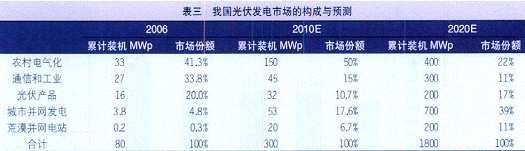 我國(guó)光伏發(fā)電的市場(chǎng)主要是通信和工業(yè)應(yīng)用、農(nóng)村電氣化和邊遠(yuǎn)地區(qū)的離網(wǎng)發(fā)電應(yīng)用等,近53.8%屬于商業(yè)化市場(chǎng)(通信工業(yè)應(yīng)用和太陽能光伏產(chǎn)品),其余的均需要政策扶持的市場(chǎng),如農(nóng)村電氣化和并網(wǎng)光伏發(fā)電。我國(guó)光伏發(fā)電市場(chǎng)的構(gòu)成與預(yù)測(cè)見表3。