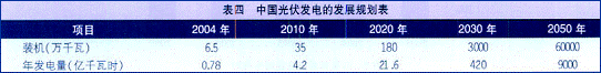 按照我國(guó)《可再生能源中長(zhǎng)期發(fā)展規(guī)劃》(見表4),到2010年中國(guó)光伏發(fā)電的累計(jì)裝機(jī)將達(dá)到350MW,到2020年將達(dá)到1.8GW,到2050年將達(dá)600GW。按照中國(guó)電力科學(xué)院的預(yù)測(cè),到2050年,中國(guó)可再生能源的電力裝機(jī)將占全國(guó)電力裝機(jī)的25%,其中光伏發(fā)電裝機(jī)將占到5%,增長(zhǎng)空間巨大。