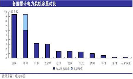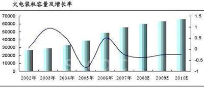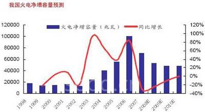 從目前情況看,隨著國(guó)家宏觀調(diào)控政策不斷加強(qiáng),2008-2010年,我國(guó)GDP增長(zhǎng)率出現(xiàn)減速恐不可避免,如果按照GDP年均增長(zhǎng)9%和發(fā)電設(shè)備與GDP的彈性系數(shù)為1.15計(jì)算,考慮“十一五”期間要淘汰0.5億千瓦落后產(chǎn)能的因素,那么發(fā)電裝機(jī)容量將可能從2007年的7.13億千瓦增加至2010年的9.47億千瓦左右,三年復(fù)合增長(zhǎng)率為10%左右,年均增加裝機(jī)容量約為0.78億千瓦,與2006年新增裝機(jī)容量相比下滑0.34億千瓦,與2007年相比也有0.16億千瓦的缺口。根據(jù)目前的在建規(guī)模,我們預(yù)計(jì)2008、2009、2010年,新增裝機(jī)容量將逐步回落至9500萬千瓦、9000萬千瓦、8000萬千瓦。至2010年年底,我國(guó)累計(jì)裝機(jī)容量將達(dá)到9.4億千瓦,超過美國(guó),成為全球第一(見圖5)。這說明未來幾年我國(guó)發(fā)電設(shè)備裝機(jī)容量增速將難免會(huì)出現(xiàn)下降,并且新增裝機(jī)容量環(huán)比可能出現(xiàn)負(fù)增長(zhǎng),發(fā)電設(shè)備步入周期下行階段明顯。