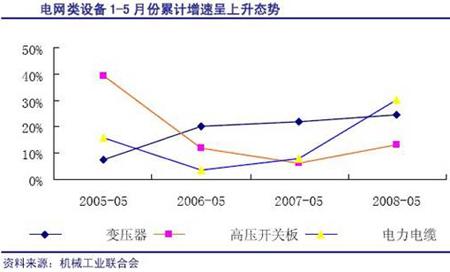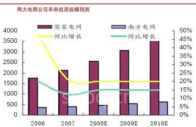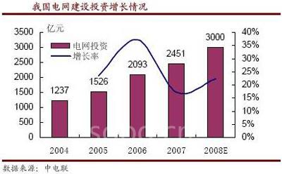 2007年,我國(guó)完成電網(wǎng)投資2451億元,同比增長(zhǎng)16%,2008年上半年完成電網(wǎng)投資1190億元,同比增長(zhǎng)27%。按照國(guó)家電網(wǎng)、南方電網(wǎng)修正后十一五投資計(jì)劃11300億元、3042億元測(cè)算,合計(jì)13541億元,年復(fù)合增長(zhǎng)率達(dá)20%,年均投資超過2600億元,同比“十五”期間超過100%,按照國(guó)家電網(wǎng)公司2006年、2007年兩年的投資狀況,我們預(yù)計(jì)未來三年電網(wǎng)投資復(fù)合增長(zhǎng)率將達(dá)到20%左右。