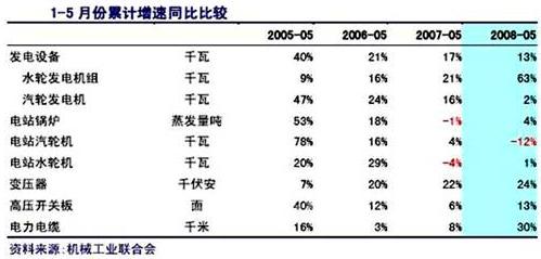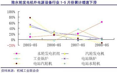 從統(tǒng)計(jì)數(shù)據(jù)看,與火電相關(guān)的鍋爐、汽輪機(jī)等發(fā)電設(shè)備受火電需求增速放緩的影響,與前幾年電力短缺帶來的高速增長(zhǎng)相比,2007年增速較前幾年已經(jīng)明顯下降。進(jìn)入2008年,鍋爐、汽輪機(jī)等產(chǎn)品下滑的速度更為顯著,鍋爐產(chǎn)品08年4月份同比增長(zhǎng)為-28.18%,汽輪機(jī)產(chǎn)品2008年4月份同比增長(zhǎng)-29.17%。