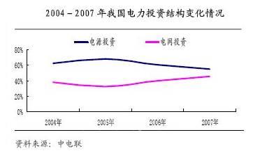 從保證電網(wǎng)安全和提高輸送效率方面出發(fā),國(guó)家從2005年開始就逐步加大電網(wǎng)領(lǐng)域的投資力度,從而使得電網(wǎng)投資在整個(gè)電力投資中的比例得到提升。2007年全國(guó)電力基本建設(shè)投資完成5493億元,同比增長(zhǎng)3.87%,其中發(fā)電基本建設(shè)投資完成3042億元,同比降低4.81%,連續(xù)兩年出現(xiàn)回落,其占電力投資比重由2006年的60.42%下降到2007年的55.37%;電網(wǎng)基本建設(shè)投資為2451億元,同比增長(zhǎng)17.1%,電網(wǎng)投資比重由2006年的39.58%上升到2007年的44.63%。隨著電網(wǎng)投資比重的逐步增加,過去電源投資規(guī)模過大、增速過快、比例過高的發(fā)展嚴(yán)重失衡的狀況逐步得到改善。