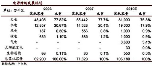 從電力結(jié)構(gòu)看,目前火電在我國(guó)現(xiàn)有電力結(jié)構(gòu)中占據(jù)絕對(duì)的優(yōu)勢(shì),占全國(guó)總發(fā)電量的比重達(dá)到83%。雖然短期內(nèi)以火電為主導(dǎo)的格局難以改變,但出于對(duì)煤炭資源未來供應(yīng)能力的擔(dān)心,以及火電廠對(duì)于環(huán)境的危害,我們認(rèn)為國(guó)家今后在可再生能源方面投入將相對(duì)較多,火電在整個(gè)電力結(jié)構(gòu)中的比例逐步下降將是必然趨勢(shì)。