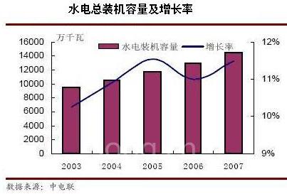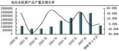 截至2007年底,我國(guó)水電裝機(jī)容量已經(jīng)達(dá)到1.45億千瓦,07年新增水電裝機(jī)1536萬千瓦。水電總裝機(jī)容量及增長(zhǎng)率見圖6。電站水輪機(jī)產(chǎn)品產(chǎn)量及增長(zhǎng)率見圖7。要達(dá)到2010年的目標(biāo),未來三年,年均新增達(dá)到1500萬千瓦即可滿足,與07年新增量持平。按照《可再生能源中長(zhǎng)期發(fā)展規(guī)劃》,至2010年我國(guó)水電裝機(jī)達(dá)到1.9億千瓦,其中大型1.4億千瓦,“十一五”期間新增裝機(jī)7300萬千瓦。“十二五”期間,我國(guó)還將進(jìn)一步加大水電投資規(guī)模,“十二五”期末我國(guó)水電裝機(jī)容量將達(dá)到2.3億千瓦,占到總裝機(jī)容量的25%,期間年均投資額將達(dá)到750億元。到2020年,我國(guó)水電裝機(jī)容量達(dá)到3億千瓦,其中大中型水電2.25億千瓦。要完成2020年目標(biāo),2010年之后年均新增1100萬千瓦即可。因此,水電新增裝機(jī)總體是平穩(wěn)的。
