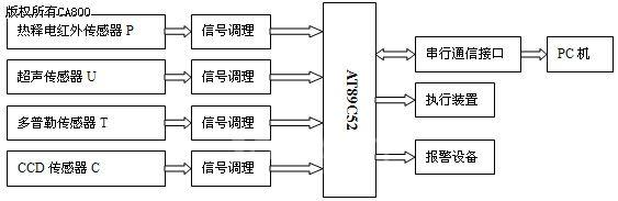 熱釋電紅外傳感器、超聲傳感器、多普勒傳感器、CCD傳感器這四種傳感器分別采集人體入侵信息中的不同特征參數(shù),將信息分別傳遞到各自的信號(hào)調(diào)理電路進(jìn)行放大、濾波去干擾和A/D轉(zhuǎn)換,并將調(diào)理后的信息傳送至單片機(jī),由單片機(jī)進(jìn)行數(shù)據(jù)預(yù)處理,實(shí)現(xiàn)對(duì)人體入侵情況的判斷并進(jìn)行報(bào)警。在組網(wǎng)應(yīng)用中,信息被傳到上位機(jī)——PC機(jī)或工控機(jī),由上位機(jī)進(jìn)行信息處理,實(shí)現(xiàn)對(duì)整體情況的監(jiān)測(cè)。