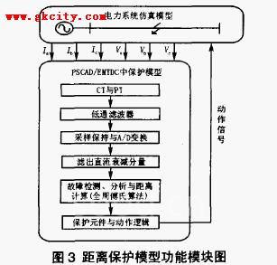 保護(hù)繼電器的建模是仿真分析的關(guān)鍵點(diǎn)之一。文獻(xiàn)[11 ^-13)對(duì)繼電保護(hù)建模做了較詳盡的介紹。文獻(xiàn)【12]還將建模仿真的結(jié)果與RTDS仿真進(jìn)行了對(duì)比,實(shí)驗(yàn)證明只要模型足夠精確,兩者之間的誤差非常小。本文中距離保護(hù)的模型是使用PSCAD的自定義模型功能并用FORTRAN代碼來(lái)實(shí)現(xiàn)的。該模型詳細(xì)模擬了實(shí)際的數(shù)字式距離保護(hù)裝置的基木環(huán)節(jié),具有轉(zhuǎn)高的可靠性。