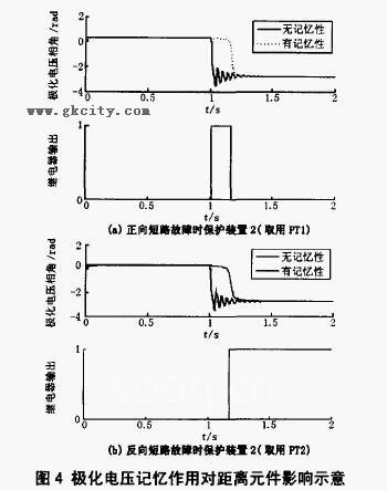 為了驗(yàn)證這一結(jié)論,我們進(jìn)行了仿真分析。圖4是極化電壓的記憶作用對(duì)距離元件影響示意圖。可以看到在短路發(fā)生后極化電壓相角發(fā)生大的波動(dòng),但是記憶環(huán)節(jié)卻能在一定時(shí)間保證其相角基本不變。對(duì)于正向故障,極化電壓記憶作用未消失前距離元件能可靠動(dòng)作,但記憶作用消失以后就不能保證動(dòng)作的可靠性了。對(duì)于反相故障,極化電壓記憶作用未消失前距離元件能可靠不動(dòng)作,但記憶作用消失以后就不能保證動(dòng)作的可靠性了。這與理論分析的結(jié)果也是完全一致的。從圖中還可以看到極化電壓的記憶作用持續(xù)時(shí)間足以保證正向故障不發(fā)生拒動(dòng)反相故障不發(fā)生誤動(dòng)。