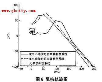 為了更好地分析故障后距離繼電器的測(cè)量電阻和電抗,圖6將各種情況下的R一曲線綜合到了一起。最初分別對(duì)應(yīng)于MOV動(dòng)作和不動(dòng)作的串聯(lián)