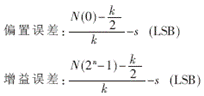 所謂的偏置誤差定義為偏置點(diǎn)的理想值與實(shí)際值的偏差。A/D的偏置點(diǎn)可以用如下方法求得:當(dāng)數(shù)字輸出由0向1轉(zhuǎn)變時(shí),模擬輸入值減去1/2 LSB的值。增益誤差是指在偏置誤差得到修正后,增益點(diǎn)的理想值與實(shí)際值的偏差。A/D的增益點(diǎn)是指當(dāng)數(shù)字輸出轉(zhuǎn)換到最大值時(shí),模擬輸入值加上1/2LSB的值。這兩種誤差都可以通過(guò)修正,調(diào)整到0。由定義可以推出偏置誤差和增益誤差按碼出現(xiàn)次數(shù)的計(jì)算公式如下: