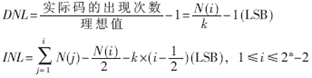 DNL定義為實(shí)際轉(zhuǎn)換碼寬與理想碼寬(1 LSB)的差。INL定義為實(shí)際轉(zhuǎn)換點(diǎn)與理想轉(zhuǎn)換點(diǎn)之差,通常要取每個(gè)轉(zhuǎn)換碼寬的中點(diǎn)與理想轉(zhuǎn)換曲線之差。所謂的理想轉(zhuǎn)換曲線有兩種定義,可以是輸出轉(zhuǎn)換點(diǎn)的最佳擬合直線,也可以是修正偏置誤差和增益誤差后的直線,第二種定義由于在計(jì)算上很方便所以實(shí)際上更常用。按碼的出現(xiàn)次數(shù)計(jì)算,第i個(gè)碼的DNL和INL值的計(jì)算公式為: