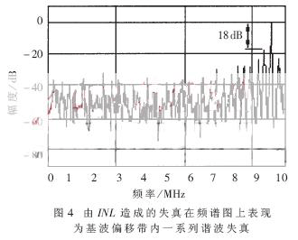 這種測(cè)試方法是利用FFT算法對(duì)A/D轉(zhuǎn)換芯片的輸出碼進(jìn)行數(shù)字信號(hào)處理,計(jì)算A/D的頻譜參數(shù),以此看出各種轉(zhuǎn)換誤差以及失真在頻譜圖上表現(xiàn)出的噪聲背景。在沒有失真的理想情況下,在輸入模擬量為正弦波時(shí),輸出頻譜應(yīng)為頻率等于輸入頻率的沖激函數(shù)的圖形。事實(shí)上,A/D轉(zhuǎn)換器的量化誤差,轉(zhuǎn)換器內(nèi)部各種噪聲,甚至包括測(cè)試系統(tǒng)噪聲,都會(huì)在頻譜圖上的噪聲背景中體現(xiàn)出來(lái);DNL、失碼、孔徑誤差、寬帶噪聲都會(huì)造成頻譜圖上噪聲背景的提升,而INL則會(huì)在測(cè)試信號(hào)的基波偏移帶內(nèi)表現(xiàn)出諧波失真(如圖4);轉(zhuǎn)換器內(nèi)部非線性部件的存在,使輸出信號(hào)相對(duì)于輸入信號(hào)在頻率上不但會(huì)有一個(gè)微小的偏移,而且會(huì)產(chǎn)生一系列的諧波分量(圖5)。