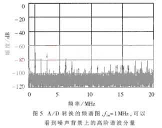 衡量A/D動(dòng)態(tài)性能的指標(biāo)有:信號(hào)噪聲比(SNR)、信號(hào)噪聲失真比(SINAD)、諧波總失真(THD)、寄生動(dòng)態(tài)范圍(SFDR)、交調(diào)失真(IMD)等。在計(jì)算出A/D轉(zhuǎn)換的頻譜后,這些參數(shù)按定義都很容易計(jì)算。計(jì)算中的諧波分量一般要求算到六階。