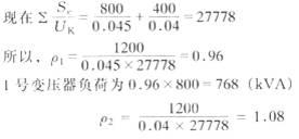 兩臺(tái)阻抗電壓不相同的變壓器并聯(lián)運(yùn)行時(shí),阻抗電壓大的變壓器(1號(hào))分擔(dān)負(fù)荷偏低;阻抗電壓小的變壓器(2 號(hào))分擔(dān)負(fù)荷偏高。這將影響變壓器的經(jīng)濟(jì)運(yùn)行。為限制2 號(hào)變壓器過負(fù)荷,必須降低總負(fù)荷,使ρ1、ρ2都小于或等于1。若ρ2=1,則S=1×0.04×27778=1111(kVA)時(shí),2 號(hào)變壓器將分擔(dān)400kVA;1 號(hào)變壓器為1111—400=711(kVA)。