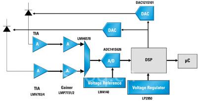反補償運算放大器最適合使用在電流-電壓轉(zhuǎn)換(跨阻)電路。在醫(yī)療儀器中,其中一個最普遍的應(yīng)用是測量血細(xì)胞中的含氧量,稱為SPO2或飽和或外圍氧氣。圖1所示為SPO2模塊的框圖,當(dāng)中的反補償放大器(TIA)用來將來自光二極管的電流轉(zhuǎn)化成電壓。