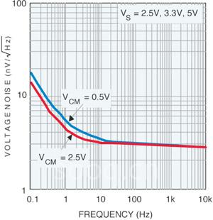 圖 2 LMP7731的輸入電壓噪聲與頻率的關(guān)系頻率、電壓噪聲