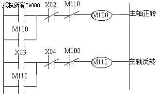 (1) 強(qiáng)電關(guān)斷優(yōu)先原則:在銑床軟件設(shè)計(jì)中,只要控制信號(hào)中有強(qiáng)電關(guān)斷的信號(hào),則不管其它信號(hào)如何都要關(guān)斷強(qiáng)電。如圖2所示,只要關(guān)斷信號(hào)XO2=1,則中間繼電器 M100 都要被關(guān)斷。 (2) 動(dòng)作互鎖原則:有些控制不能同時(shí)動(dòng)作,就要進(jìn)行互鎖。如主軸正、反轉(zhuǎn)控制,圖 3為主軸互鎖控制示意圖,任何一個(gè)回路啟動(dòng)后必須同時(shí)關(guān)斷另一 個(gè)回路,從而保證兩者不能同時(shí)動(dòng)作。