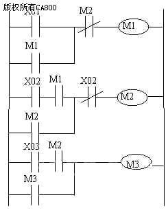 (3) 順序聯(lián)鎖控制原則:即有些控制要求次序不能顛倒,這就要求前一個(gè)動(dòng)作常開觸點(diǎn)串在下一個(gè)控制動(dòng)作中,同時(shí)將后一個(gè)動(dòng)作中的常閉觸點(diǎn)串在上一動(dòng)作的控制回路中,如圖4 所示。