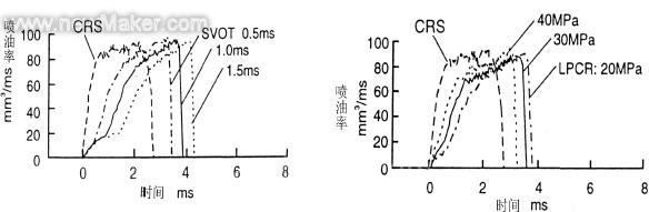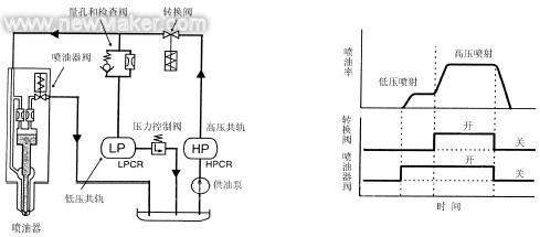 由于共軌系統(tǒng)具有極大的柔性,在噴油壓力和噴油定時控制方面具有更大的自由度,使得在任何運行狀態(tài)下實現噴油壓力和噴油定時的優(yōu)化控制成為可能,這使得共軌系統(tǒng)成為未來最滿意的燃油噴射系統(tǒng)之一。但是共軌系統(tǒng)具有一個近似于矩形的噴油規(guī)律,相對于脈動式噴射系統(tǒng)如泵管嘴系統(tǒng)和凸輪驅動的整體噴油器系統(tǒng)來說,起初的噴油量較大。這產生的后果就是發(fā)動機的燃燒噪聲和Nox水平較高,為解決此矛盾,提出了新一代共軌系統(tǒng)[2]的概念。