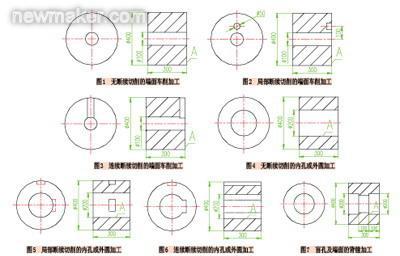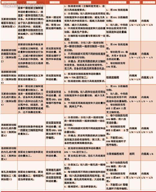 東風(fēng)柳州汽車有限公司經(jīng)過(guò)近15年應(yīng)用數(shù)控機(jī)床的實(shí)踐與探索,逐步擺脫傳統(tǒng)加工工藝和加工編程編制方法的約束,找到一種有效提高生產(chǎn)效率、降低加工成本的方法。根據(jù)各種不同類型的零件,按加工部位的形狀進(jìn)行分類,可分成如表所列的典型類型,在零件的加工過(guò)程中,在設(shè)備、刀具和夾具已確定的前提下,線速度、進(jìn)給量和切削深度是影響生產(chǎn)效率、刀具耐用度、表面粗造度及尺寸精度的主要變量,因此,靈活地運(yùn)用非常規(guī)的加工工藝和編程方法解決好它們之間的關(guān)系,可提高生產(chǎn)效率,降低加工成本,為直觀閱讀現(xiàn)列表進(jìn)行介紹。
